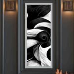 Enhance your space with this striking vertical abstract art print. It showcases dynamic black and white swirls and flowing forms, creating a visually captivating and sophisticated piece. Framed sleekly, this artwork is perfect for adding a modern, elegant touch to narrow wall spaces, entryways, or as part of a gallery wall. Ideal for contemporary decor styles.