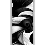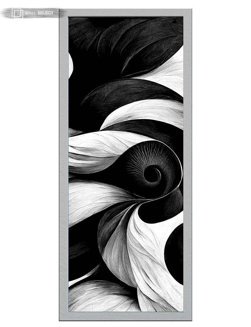 Mesmerizing vertical framed print featuring elegant black and white abstract swirls and curves.