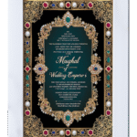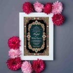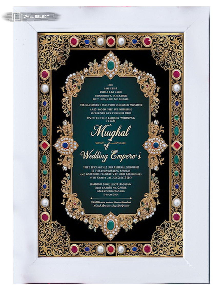 Turn your magnificent wedding card into a lasting work of art. This framing service is perfect for preserving ornate, Mughal-style invitations. The clean white frame beautifully highlights the royal green and gold details, creating a timeless keepsake of your special day.