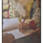 A beautiful photo capturing a bride’s hand, adorned with henna and flowers, signing the Nikah contract. A sacred and momentous part of a traditional wedding.